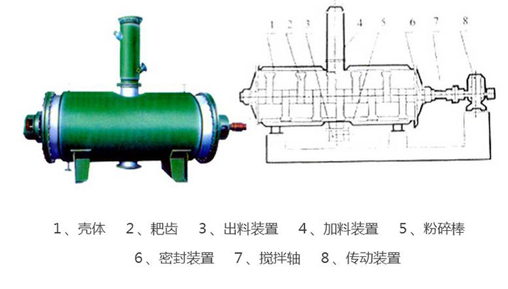 真空耙式干燥機】 具有結構簡單,操作方便,使用周期長,性能穩定可靠,蒸汽耗量小,適用性能強,產品質量好,特別適用于不耐高溫、易燃、調溫下易氧化的膏狀物料的干燥,該機經用戶長期使用證明是一良好的干燥設備。原理:被干燥物料從殼體上方正中間加入,在不斷正反轉動的耙齒的攪拌下,物料軸向來回走動,與殼體內壁接觸的表面不斷更新,受到蒸汽的間接加熱,耙齒的均勻攪拌,粉碎棒的粉碎,使物料表面水分更有利的排出,氣化的水分經干式除塵器、濕式除塵器、冷凝器,從真空泵出口處放空。結構:真空耙式干燥機的主要部件